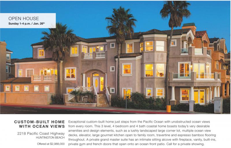 Exceptional custom-built home just steps from the Pacific Ocean with unobstructed ocean views from every room. This 3 level, 4 bedroom and 4 bath coastal home boasts today’s very desirable amenities and design elements, such as a lushly landscaped large corner lot, multiple ocean view decks, elevator, large gourmet kitchen open to family room, travertine and espresso bamboo flooring throughout. A private grand master suite has an intimate sitting alcove with fireplace, vanity, built-ins, private gym and french doors that open onto an ocean front patio. Call for a private showing.
