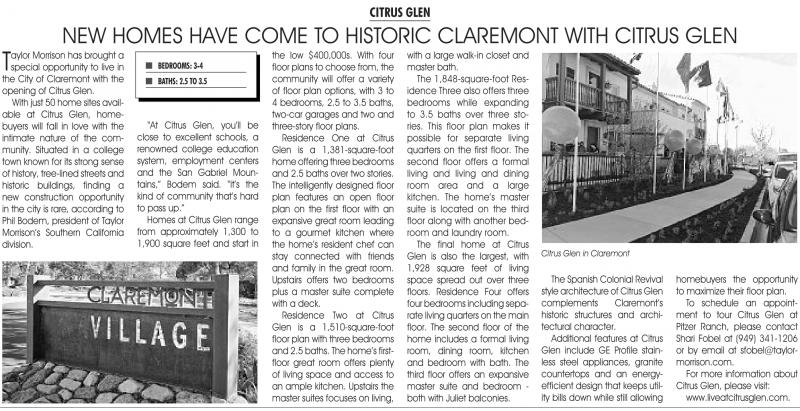 “at Citrus Glen, you’ll be close to excellent schools, a renowned college education system, employment centers and the San Gabriel Mountains,” Bodem said. “it’s the kind of community that’s hard to pass up.”