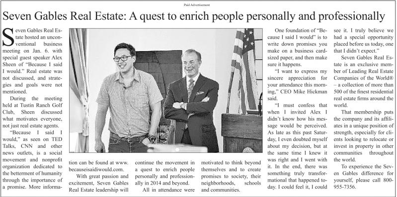 Gables Real Estate hosted an unconventional business meeting on Jan. 6. with special guest speaker Alex Sheen of “Because I said I would.” Real estate was not discussed, and strategies and goals were not mentioned.