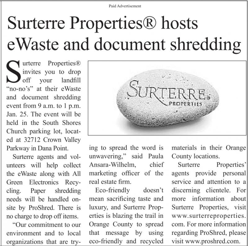 Paid Advertisement Surterre Properties® hosts eWaste and document shredding Surterre Properties® invites you to drop off your landfill “no-no’s” at their eWaste and document shredding event from 9 a.m. to 1 p.m. Jan. 25. The event will be held in the South Shores Church parking lot, located at 32712 Crown Valley Parkway in Dana Point. Surterre agents and volunteers will help collect the eWaste along with All Green Electronics Recycling. Paper shredding needs will be handled onsite by ProShred. There is no charge to drop off items. “Our commitment to our environment and to local organizations that are try ing to spread the word is unwavering,” said Paula Ansara-Wilhelm, chief marketing officer of the real estate firm. Eco-friendly doesn’t mean sacrificing taste and luxury, and Surterre Properties is blazing the trail in Orange County to spread that message by using eco-friendly and recycled materials in their Orange County locations. Surterre Properties’ agents provide personal service and attention to a discerning clientele. For more information about Surterre Properties, visit www.surterreproperties. com. For more information regarding ProShred, please visit www.proshred.com. See also
