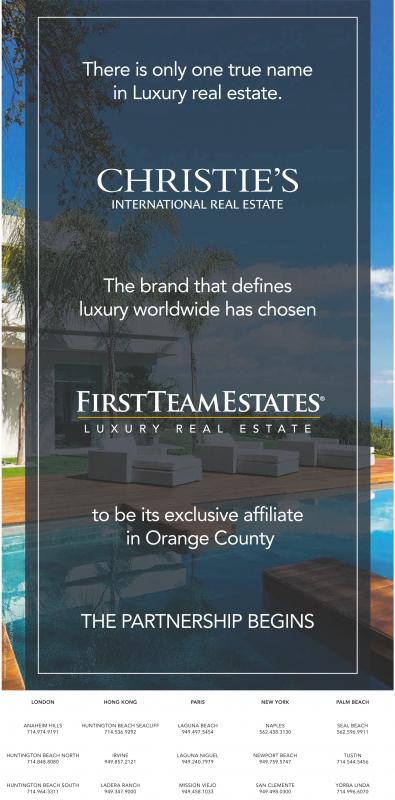 There is only one true name in Luxury real estate. The brand that defines luxury worldwide has chosen FirstTeamEstates to be its exclusive affiliate in Orange County THE PARTNERSHIP BEGINS LONDON HONG KONG PARIS NEW YORK PALM BEACH ANAHEIM HILLS 714.974.9191 HUNTINGTON BEACH SEACLIFF 714.536.9292 LAGUNA BEACH 949.497.5454 NAPLES 562.438.3130 SEAL BEACH 562.596.9911 HUNTINGTON BEACH NORTH 714.848.8080 IRVINE 949.857.2121 LAGUNA NIGUEL 949.240.7979 NEWPORT BEACH 949.759.5747 TUSTIN 714.544.5456 HUNTINGTON BEACH SOUTH 714.964.3311 LADERA RANCH 949.347.9000 MISSION VIEJO 949.458.1033 SAN CLEMENTE 949.498.0300 YORBA LINDA 714.996.6070