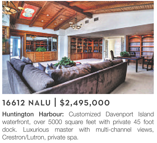Huntington Harbour: Customized Davenport Island waterfront, over 5000 square feet with private 45 foot dock. Luxurious master with multi-channel views, Crestron/Lutron, private spa.