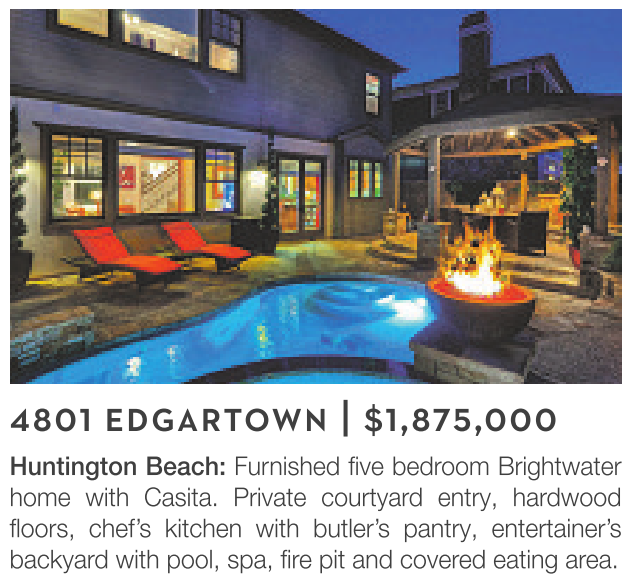 4801 EDGARTOWN | $1,875,000 Huntington Beach: Furnished five bedroom Brightwater home with Casita. Private courtyard entry, hardwood floors, chef’s kitchen with butler’s pantry, entertainer’s backyard with pool, spa, fire pit and covered eating area.