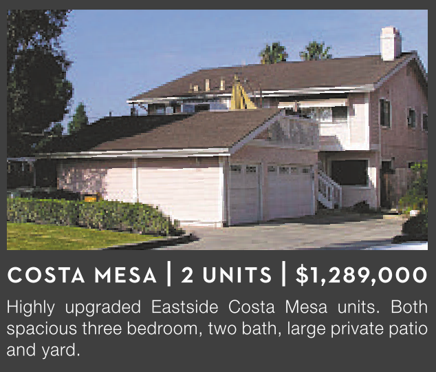 Highly upgraded Eastside Costa Mesa units. Both spacious three bedroom, two bath, large private patio and yard.
