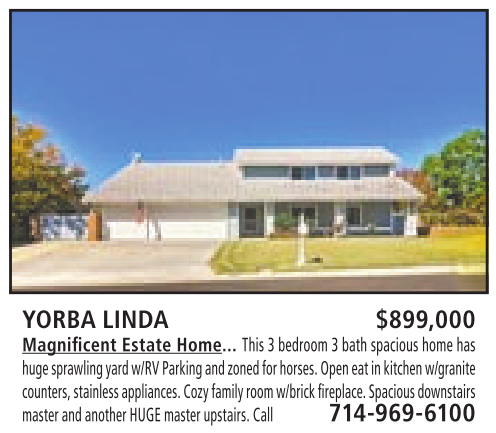 YORBA LINDA $899,000 Magnificent Estate Home... This 3bedroom 3bath spacious home has hugesprawlingyardw/RVParking andzonedfor horses. Open eat in kitchen w/granite counters,stainless appliances. Cozy family room w/brick fireplace.Spacious downstairs master and another HUGE master upstairs. Call 714-969-6100