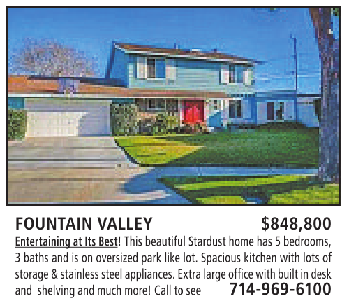 FOUNTAIN VALLEY $848,800 Entertaining at Its Best! This beautifulStardust home has5bedrooms, 3baths and isonoversized park like lot. Spacious kitchen with lots of storage&stainless steelappliances. Extralarge officewithbuilt in desk and shelving andmuch more!Calltosee 714-969-6100