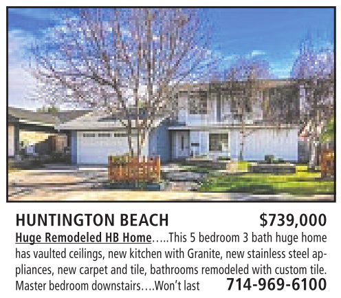 HUNTINGTON BEACH $739,000 Huge Remodeled HBHome…..This 5bedroom 3bath huge home hasvaulted ceilings,new kitchen with Granite,new stainlesssteel appliances, new carpet and tile, bathrooms remodeled with custom tile. Master bedroomdownstairs….Won’t last 714-969-6100
