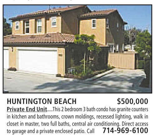 HUNTINGTON BEACH $500,000 PrivateEnd Unit…This 2bedroom3bathcondohas granite counters in kitchen and bathrooms, crown moldings, recessed lighting, walk in closet in master, two full baths, central air conditioning. Direct access to garageand aprivateenclosedpatio.Call 714-969-6100