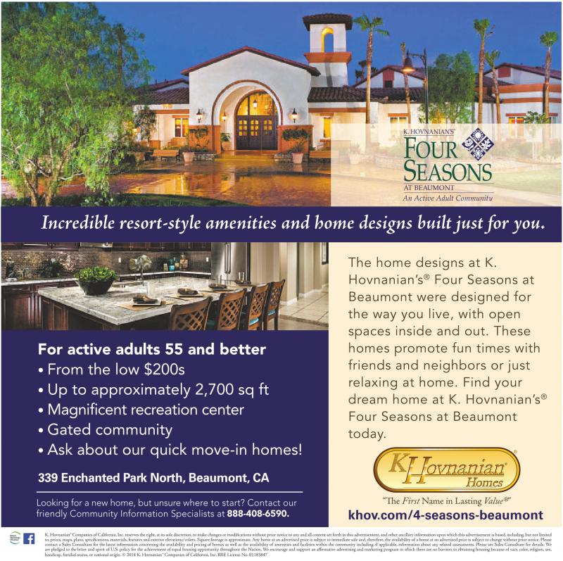 K. Hovnanian® Companies of California,Inc.reservesthe right, at its sole discretion, to makechanges or modificationswithout prior noticetoany and all contentset forthinthisadvertisement, and other ancillaryinformationupon whichthis advertisementisbased,including, butnot limited to,prices, maps, plans, specifications, materials, features and exterior elevations/colors. Squarefootageisapproximate.Any home at an advertisedprice is subjecttoimmediate sale and,therefore,the availability of ahome at an advertised price is subjecttochange without prior notice. Please contactaSales Consultantfor thelatest information concerningthe availability and pricingofhomes as well as theavailability of amenities and facilities within thecommunity including, if applicable, information about anyrelatedassessments. Please see Sales Consultantfor details. We arepledged to theletterand spirit of U.S. policyfor theachievementofequal housingopportunity throughout theNation. We encourage and support an affirmative advertisingand marketingprogram in whichthere arenobarrierstoobtaininghousingbecause of race,color, religion, sex,