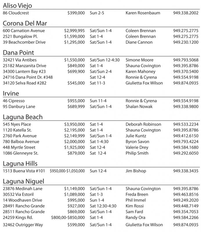 545 Nyes Place $3,950,000 Sat 1-4 Deborah Robinson 949.533.2234 1120 Katella St. $2,195,000 Sat 1-4 Shauna Covington 949.395.8786 2760 Park Avenue $2,149,999 Sat/Sun 1-4 Julie Kuntz 949.412.6150 780 Balboa Avenue $2,000,000 Sat 1-4:30 Byron Savon 949.793.4224 448 Myrtle Street $1,925,000 Sat 12-4 Valerie Drey 949.584.1680 1086 Glenneyre St. $879,000 Sat 12-4 Philip Smith 949.292.6050