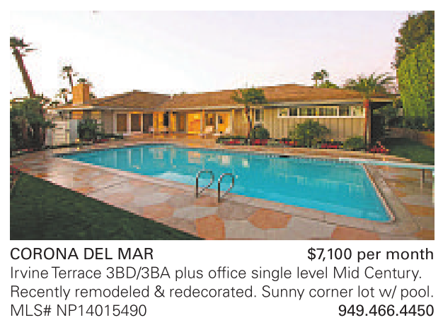 CORONA DEL MAR $7,100 per month Irvine Terrace 3BD/3BA plus office single level Mid Century. Recently remodeled & redecorated. Sunny corner lot w/ pool. MLS# NP14015490 949.466.4450