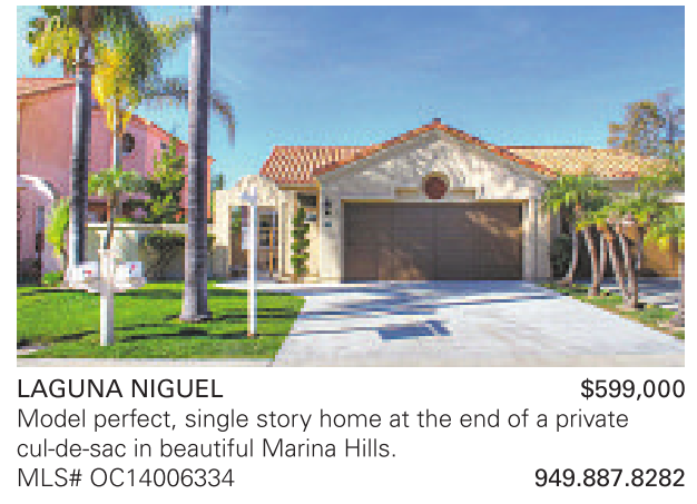 LAGUNA NIGUEL $599,000 Model perfect, single story home at the end of a private cul-de-sac in beautiful Marina Hills. MLS# OC14006334 949.887.8282