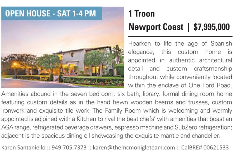 OPEN HOUSE - SAT 1-4 PM 1 Troon Newport Coast | $7,995,000 Hearken to life the age of Spanish elegance, this custom home is appointed in authentic architectural detail and custom craftsmanship throughout while conveniently located within the enclave of One Ford Road. Amenities abound in the seven bedroom, six bath, library, formal dining room home featuring custom details as in the hand hewn wooden beams and trusses, custom ironwork and exquisite tile work. The Family Room which is welcoming and warmly appointed is adjoined with aKitchen to rival the best chefs’with amenities that boast an AGArange, refrigerated beverage drawers, espresso machine and SubZero refrigeration; adjacent is the spacious dining ell showcasing the exquisite mantle and chandelier. Karen Santaniello :: 949.705.7373 :: karen@themcmonigleteam.com :: CalBRE# 00621533 See also