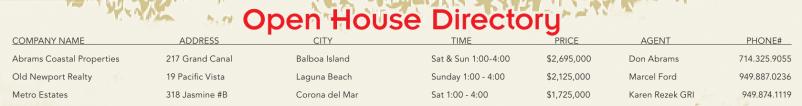 Open House Directory Open House Directory COMPANY NAME ADDRESS CITY TIME PRICE AGENT PHONE# Abrams Coastal Properties 217 Grand Canal Balboa Island Sat &Sun 1:00-4:00 $2,695,000 Don Abrams 714.325.9055 Old Newport Realty 19 Pacific Vista Laguna Beach Sunday 1:00 -4:00 $2,125,000 Marcel Ford 949.887.0236 Metro Estates 318 Jasmine #B Corona del Mar Sat 1:00 -4:00 $1,725,000 Karen Rezek GRI 949.874.1119