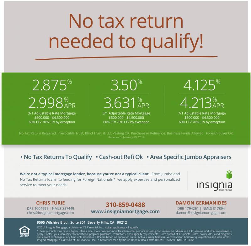 ©2014 Insignia Mortgage, a division of CS Financial, Inc. Not all applicants will qualify. *These products may have ahigher interest rate, more points or more fees than other produts requiring documentation. Minimum FICO, reserve, and other requirements apply. Contact your loan ofÿcer for additional program guidelines, restrictions, and eligibility requirements. Rates quoted at 1.5 points. Rates, points, APRs and programs are subject to change at any time until locked-in. LTVs are based on appraised value. Actual closing times will vary based on borrower qualiÿcations and loan terms. Insignia Mortgage is a division of CS Financial, Inc., a broker licensed by the CA Dept. of Real Estate BRE# 01257559 | NMLS#31132.