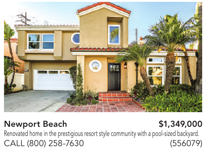 Newport Beach $1,349,000 Renovated home inthe prestigious resort style community with apool-sized backyard. CALL (800) 258-7630 (556079)