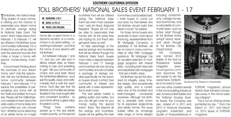 home they could possibly build. i invite buyers to come out and learn for themselves why Toll Brothers should build their dream home!” he added.