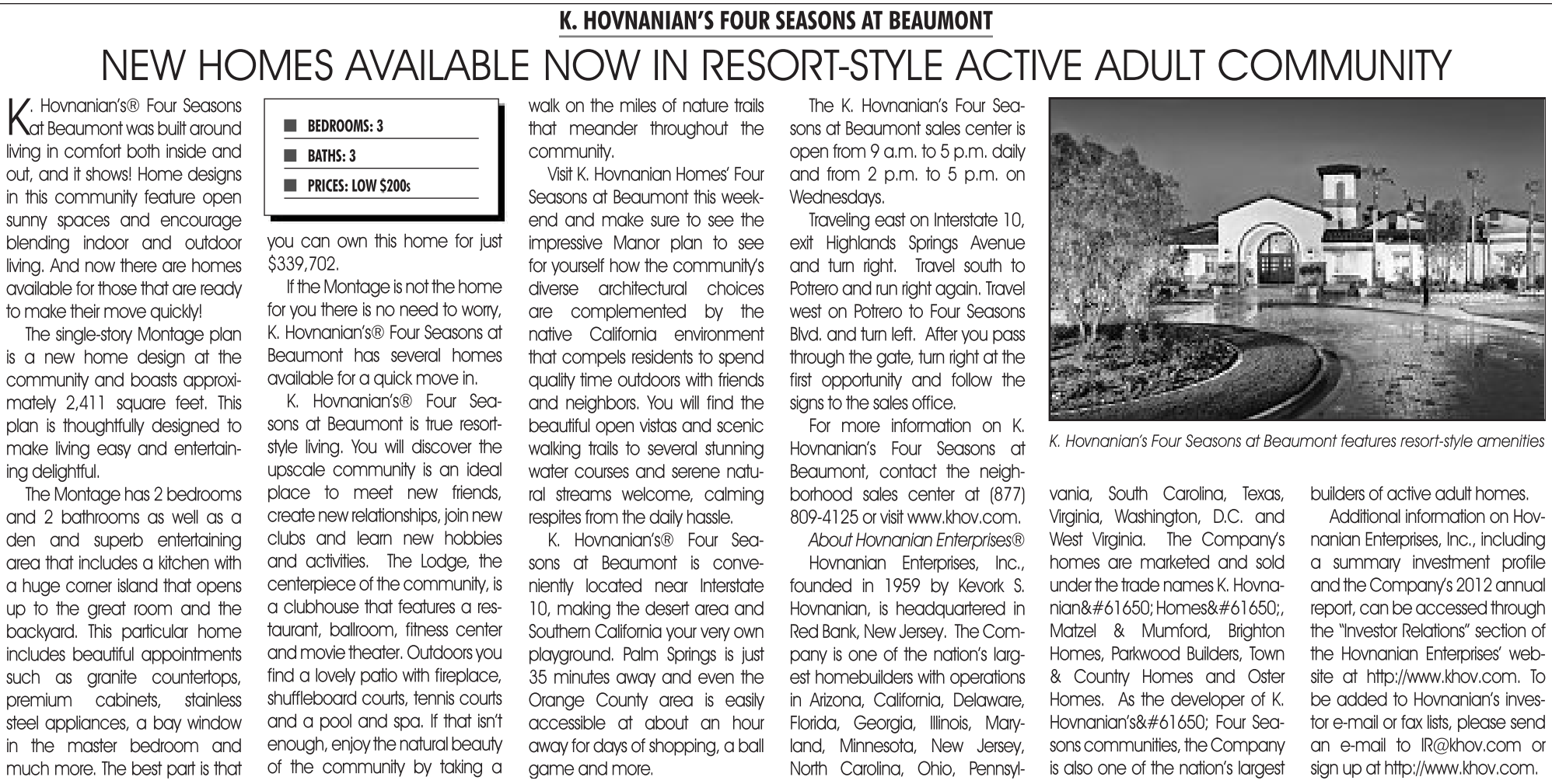 Hovnanian’s Four Seasons at Beaumont, contact the neighborhood sales center at (877) 809-4125 or visit www.khov.com.