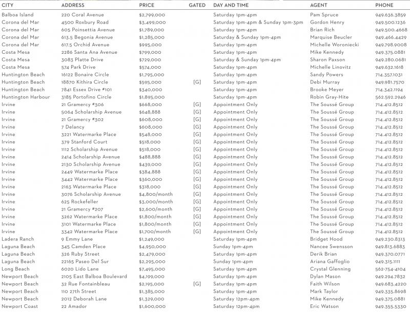 Balboa Island 220 Coral Avenue $2,799,000 Saturday 1pm-4pm Pam Spruce 949.636.3859 Corona del Mar 4500 Roxbury Road $3,499,000 Saturday 1pm-4pm & Sunday 1pm-3pm Gordon Henry 949.500.1236 Corona del Mar 605 Poinsettia Avenue $1,789,000 Saturday 1pm-4pm Brian Rich 949.500.4668 Corona del Mar 613.5 Begonia Avenue $1,285,000 Saturday & Sunday 1pm-4pm Marquise Beucler 949.466.4429 Corona del Mar 617.5 Orchid Avenue $995,000 Saturday 1pm-4pm Michelle Woroniecki 949.798.9008 Costa Mesa 2286 Santa Ana Avenue $799,000 Saturday 1pm-4pm Mike Kennedy 949.375.0881 Costa Mesa 3083 Platte Drive $729,000 Saturday & Sunday 1pm-4pm Sharon Paxson 949.280.0681 Costa Mesa 574 Park Drive $574,000 Saturday 1pm-4pm Michelle Linovitz 949.632.1618 Huntington Beach 16122 Bonaire Circle $1,795,000 Saturday 1pm-4pm Sandy Powers 714.357.1031 Huntington Beach 18870 Kithira Circle $595,000 [G] Saturday 1pm-4pm Debi Murray 949.981.7570 Huntington Beach 7841 Essex Drive #101 $340,000 Saturday 1pm-4pm Brooke Meyer 714.342.1194 Huntington Harbour 3185 Portofino Circle $1,895,000 Saturday 1pm-4pm Robin Gray-Hite 562.592.2946 Irvine 21 Gramercy #306 $668,000 [G] Appointment Only The Soussé Group 714.412.8512 Irvine 5064 Scholarship Avenue $648,888 [G] Appointment Only The Soussé Group 714.412.8512 Irvine 21 Gramercy #302 $608,000 [G] Appointment Only The Soussé Group 714.412.8512 Irvine 7 Delancy $608,000 [G] Appointment Only The Soussé Group 714.412.8512 Irvine 3221 Watermarke Place $548,000 [G] Appointment Only The Soussé Group 714.412.8512 Irvine 379 Stanford Court $518,000 [G] Appointment Only The Soussé Group 714.412.8512 Irvine 1112 Scholarship Avenue $518,000 [G] Appointment Only The Soussé Group 714.412.8512 Irvine 2414 Scholarship Avenue $488,888 [G] Appointment Only The Soussé Group 714.412.8512 Irvine 2130 Scholarship Avenue $439,000 [G] Appointment Only The Soussé Group 714.412.8512 Irvine 2449 Watermarke Place $384,888 [G] Appointment Only The Soussé Group 714.412.8512 Irvine 3442 Watermarke Place $360,000 [G] Appointment Only The Soussé Group 714.412.8512 Irvine 2163 Watermarke Place $318,000 [G] Appointment Only The Soussé Group 714.412.8512 Irvine 3076 Scholarship Avenue $4,800/month [G] Appointment Only The Soussé Group 714.412.8512 Irvine 625 Rockefeller $3,000/month [G] Appointment Only The Soussé Group 714.412.8512 Irvine 21 Gramercy #207 $2,600/month [G] Appointment Only The Soussé Group 714.412.8512 Irvine 3262 Watermarke Place $1,800/month [G] Appointment Only The Soussé Group 714.412.8512 Irvine 3101 Watermarke Place $1,800/month [G] Appointment Only The Soussé Group 714.412.8512 Irvine 3342 Watermarke Place $1,700/month [G] Appointment Only The Soussé Group 714.412.8512 Ladera Ranch 9 Emmy Lane $1,249,000 Saturday 1pm-4pm Bridget Hood 949.230.8313 Laguna Beach 345 Camden Place $4,950,000 Sunday 1pm-4pm Nancee Swensson 949.813.6883 Laguna Beach 326 Ruby Street $2,479,000 Saturday 1pm-4pm Derik Brian 949.370.0771 Laguna Beach 22165 Paseo Del Sur $2,295,000 Sunday 1pm-4pm Ariana Gaffoglio 949.315.1111 Long Beach 6020 Lido Lane $7,495,000 Saturday 1pm-4pm Crystal Glenning 562-754-4104 Newport Beach 2105 East Balboa Boulevard $4,199,000 Saturday 1pm-4pm Dylan Mason 949.294.7832 Newport Beach 32 Rue Fontainbleau $2,195,000 [G] Saturday 1pm-4pm Faith Wilson 949.683.4220 Newport Beach 110 27th Street $1,385,000 Saturday 1pm-4pm Mark Taylor 949.335.8698 Newport Beach 2012 Deborah Lane $1,329,000 Saturday 12pm-4pm Mike Kennedy 949.375.0881 Newport Coast 22 Amador $1,600,000 Saturday 12pm-4pm Eric Watson 949.355.5330