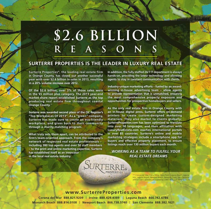 Of the $2.6 billion, over 3% of those sales were in the $5 million plus category. The 2013 year-end market share report established Surterre as the top producing real estate firm throughout coastal Orange County. **
