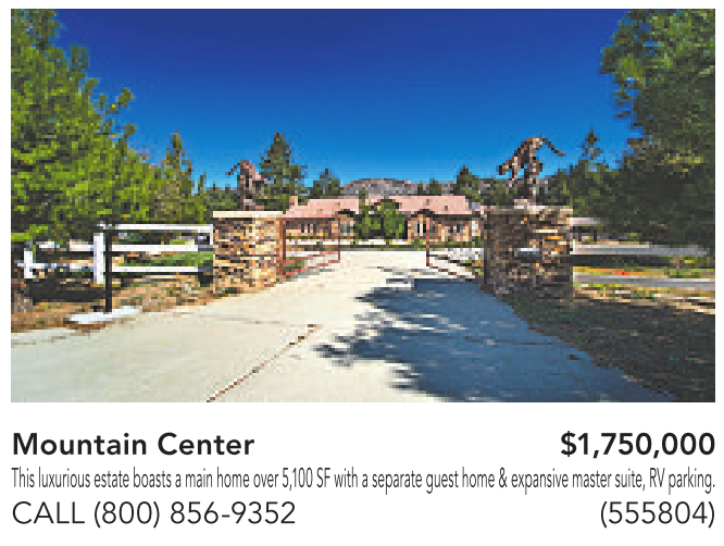 Mountain Center $1,750,000 This luxurious estate boasts amain home over 5,100 SF with aseparate guest home &expansive master suite, RVparking. CALL (800) 856-9352 (555804)