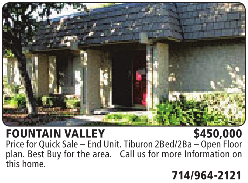 FOUNTAIN VALLEY $450,000 Pricefor QuickSale–End Unit.Tiburon 2Bed/2Ba –OpenFloor plan. Best Buy for the area. Call us for more Information on this home.