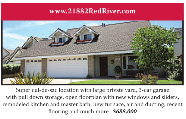 www.21882RedRiver.com Supercul-de-sac location with largeprivate yard,3-car garage with pull downstorage, open floorplan with newwindowsand sliders, remodeledkitchen and master bath,new furnace, air and ducting,recent flooring and much more. $688,000