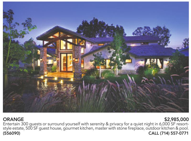 ORANGE $2,985,000 Entertain 300guestsorsurround yourself with serenity &privacy foraquietnight in 6,000 SF resortstyleestate, 500SFguest house, gourmet kitchen, master with stonefireplace,outdoor kitchen&pool.
