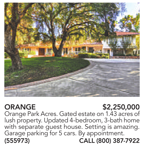ORANGE $2,250,000 Orange Park Acres. Gated estate on 1.43 acresof lush property.Updated 4-bedroom,3-bathhome with separate guest house. Setting is amazing. Garage parkingfor 5cars. By appointment. (555973) CALL (800)387-7922