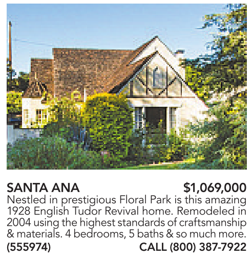 SANTA ANA $1,069,000 Nestled in prestigious Floral Park is this amazing 1928 English Tudor Revival home. Remodeled in 2004 usingthe higheststandardsofcraftsmanship &materials. 4bedrooms, 5baths &somuchmore. (555974) CALL (800)387-7922