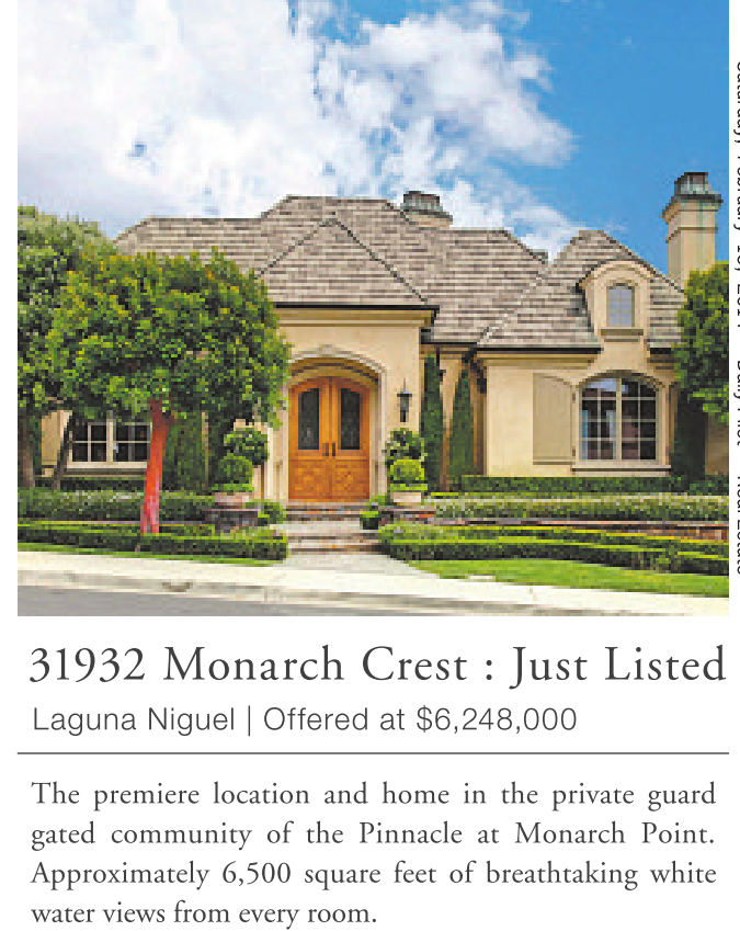 31932 Monarch Crest : Just Listed Laguna Niguel | Offered at $6,248,000 The premiere location and home in the private guard gated community of the Pinnacle at Monarch Point. Approximately 6,500 square feet of breathtaking white water views from every room.