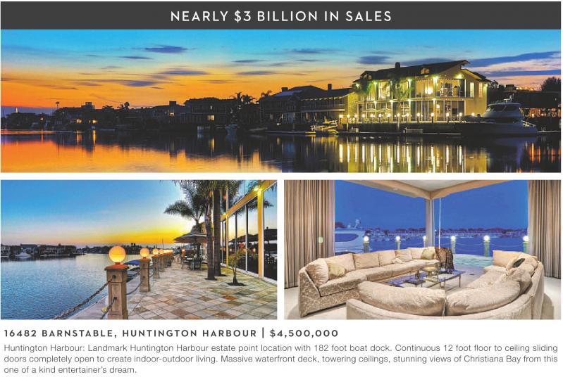 N E A R LY $ 3 B I L L I O N I N SA L E S 16482 BARNSTABLE, HUNTINGTON HARBOUR | $4,500,000 Huntington Harbour: Landmark Huntington Harbour estate point location with 182 foot boat dock. Continuous 12 foot floor to ceiling sliding doors completely open to create indoor-outdoor living. Massive waterfront deck, towering ceilings, stunning views of Christiana Bay from this one of a kind entertainer’s dream.
