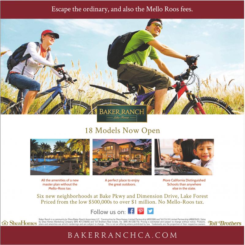 Baker Ranch is acommunity by Shea/Baker Ranch Associates LLC. Construction by Shea Homes Limited Partnership (#855368) and Toll CA VII Limited Partnership (#B683543), Sales by Shea Homes Marketing Company (BRE #01378646) and Toll Brothers Real Estate, Inc. (BRE #01206770). Pricing is estimated and subject to change without notice. Products, plans and amenities are artist’s renderings and are subject to change. This is not an offering where prohibited by law. Trademarks are the properties of their respective owners.