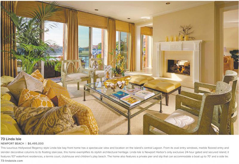 NEWPORT BEACH | $6,495,000 This luxurious Hollywood Regency style Linda Isle bay front home has a spectacular view and location on the island’s central Lagoon. From its oval entry windows, marble floored entry and slender decorative columns to its floating staircase, this home exemplifies its stylish architectural heritage. Linda Isle is Newport Harbor’s only exclusive 24-hour gated and secured island; it features 107 waterfront residences, a tennis court, clubhouse and children’s play beach. The home also features a private pier and slip that can accommodate a boat up to 70’ and a side tie. 73-lindaisle.com