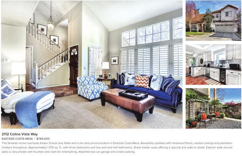EASTSIDE COSTA MESA | $789,000 This fantastic home overlooks Kaiser School play fields and is the best priced location in Eastside Costa Mesa. Beautifully updated with hardwood floors, vaulted ceilings and plantation shutters throughout. Approximately 1,700 sq. ft., with three bedrooms and two and one-half bathrooms. Great master suite offering a spa tub and walk-in closet. Exterior walk around patio is very private with fountain and room for entertaining. Attached two-car garage and onsite parking.