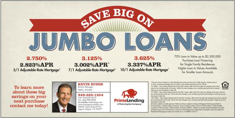 *This summary is based on a$2,500,000 loan amount, loan term of 360 months, interest rate of 3.125%, annual percentage rate of 3.002%, and monthly payment of $10,709.39. 1 5/1 ARM –Has afixed interest rate for the first 5years, after which the rate can change once every year for the remaining life of the loan. When the rate changes, your monthly payments will increase if rates go up and decrease if rates fall. 2 7/1 ARM –Has afixed interest rate for the first 7years, after which the rate can change once every year for the remaining life of the loan. When the rate changes, your monthly payments will increase if rates go up and decrease if rates fall. 3 10/1 ARM –Has afixed interest rate for the first 10 years, after which the rate can change once every year for the remaining life of the loan. When the rate changes, your monthly payments will increase if rates go up and decrease if rates fall. All loans subject to credit approval. Rates and fees subject to change. Mortgage financing provided by PrimeLending, aPlainsCapital Company.Equal Housing Lender.©2014 PrimeLending, aPlainsCapital Company.PrimeLending, aPlainsCapital Company (NMLS: 13649) is awholly owned subsidiary of astatechartered bank and is licensed by Licensed by the DepartmentofBusiness Oversight under the California Residential Mortgage Lending Act- lender lic no. 4130996.V121013.