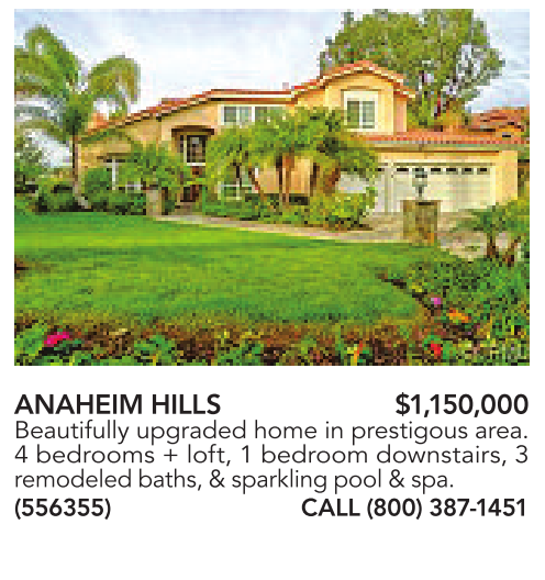 ANAHEIM HILLS $1,150,000 Beautifully upgraded home in prestigous area. 4 bedrooms + loft, 1 bedroom downstairs, 3 remodeledbaths,&sparkling pool &spa. (556355) CALL (800)387-1451