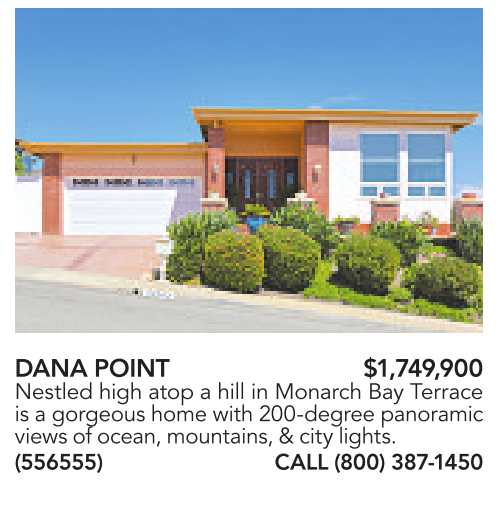 DANA POINT $1,749,900 Nestled high atop a hill in Monarch Bay Terrace is agorgeoushomewith200-degreepanoramic viewsofocean,mountains,&citylights. (556555) CALL(800) 387-1450