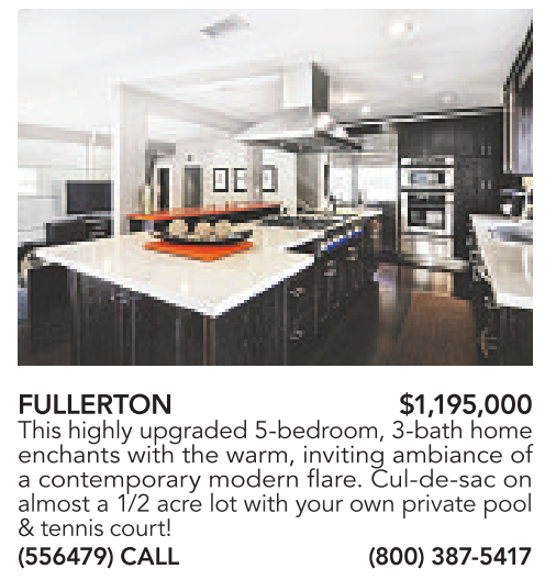 FULLERTON $1,195,000 This highly upgraded 5-bedroom, 3-bath home enchants with the warm, inviting ambiance of a contemporary modern flare. Cul-de-sac on almost a 1/2 acre lot with your own private pool &tenniscourt! (556479) CALL (800)387-5417