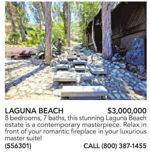 LAGUNA BEACH $3,000,000 8bedrooms, 7baths,thisstunningLagunaBeach estate is a contemporary masterpiece. Relax in front of your romantic fireplace in your luxurious master suite! (556301) CALL (800)387-1455