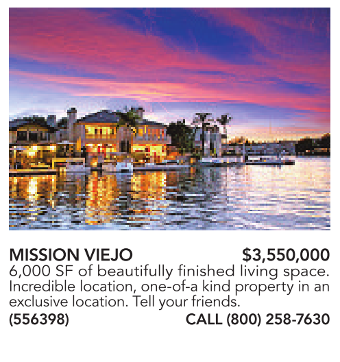 MISSION VIEJO $3,550,000 6,000 SF of beautifully finished living space. Incredible location, one-of-a kind property in an exclusivelocation. Tell your friends. (556398) CALL (800)258-7630