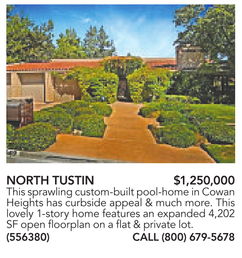 NORTH TUSTIN $1,250,000 This sprawlingcustom-builtpool-home in Cowan Heights has curbside appeal & much more. This lovely 1-story home features an expanded 4,202 SF open floorplan on aflat &private lot. (556380) CALL (800)679-5678