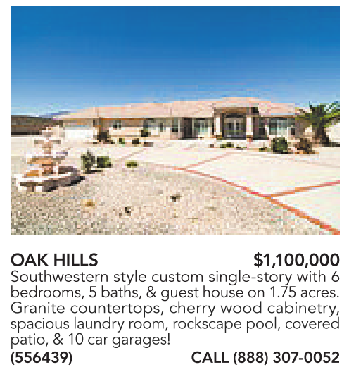 OAK HILLS $1,100,000 Southwestern style custom single-story with 6 bedrooms, 5baths,&guest houseon1.75acres. Granite countertops, cherry wood cabinetry, spacious laundry room,rockscape pool,covered patio, &10car garages! (556439) CALL (888)307-0052