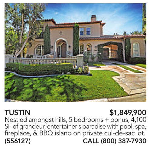 TUSTIN $1,849,900 Nestledamongst hills, 5bedrooms+bonus,4,100 SF of grandeur, entertainer’sparadisewithpool, spa, fireplace,&BBQ island on privatecul-de-saclot. (556127) CALL (800)387-7930
