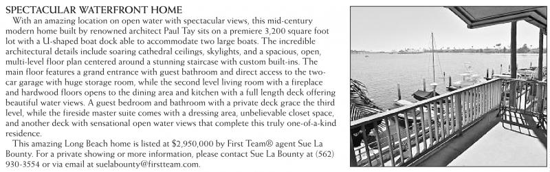 SPECTACULAR WATERFRONT HOME With an amazing location on open water with spectacular views, this mid-century modern home built by renowned architect Paul Tay sits on a premiere 3,200 square foot lot with a U-shaped boat dock able to accommodate two large boats. The incredible architectural details include soaring cathedral ceilings, skylights, and a spacious, open, multi-level floor plan centered around a stunning staircase with custom built-ins. The main floor features a grand entrance with guest bathroom and direct access to the twocar garage with huge storage room, while the second level living room with a fireplace and hardwood floors opens to the dining area and kitchen with a full length deck offering beautiful water views. A guest bedroom and bathroom with a private deck grace the third level, while the fireside master suite comes with a dressing area, unbelievable closet space, and another deck with sensational open water views that complete this truly one-of-a-kind residence. This amazing Long Beach home is listed at $2,950,000 by First Team® agent Sue La Bounty. For a private showing or more information, please contact Sue La Bounty at (562) 930-3554 or via email at suelabounty@firstteam.com.
