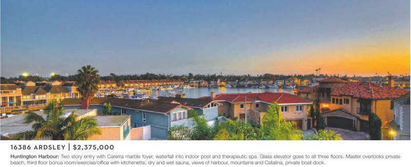 16386 ARDSLEY | $2,375,000 Huntington Harbour: Two story entry with Carerra marble foyer, waterfall into indoor pool and therapeutic spa. Glass elevator goes to all three floors. Master overlooks private beach, third floor bonus room/exercise/office with kitchenette, dry and wet sauna, views of harbour, mountains and Catalina, private boat dock.