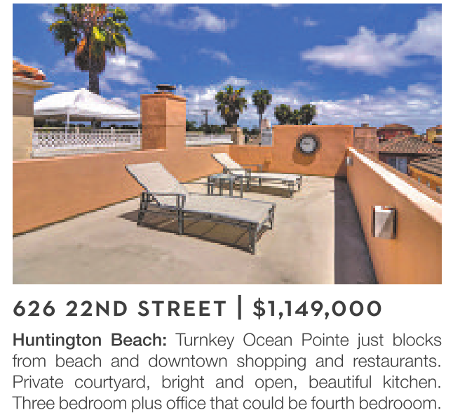 Huntington Beach: Turnkey Ocean Pointe just blocks from beach and downtown shopping and restaurants. Private courtyard, bright and open, beautiful kitchen. Three bedroom plus office that could be fourth bedrooom.