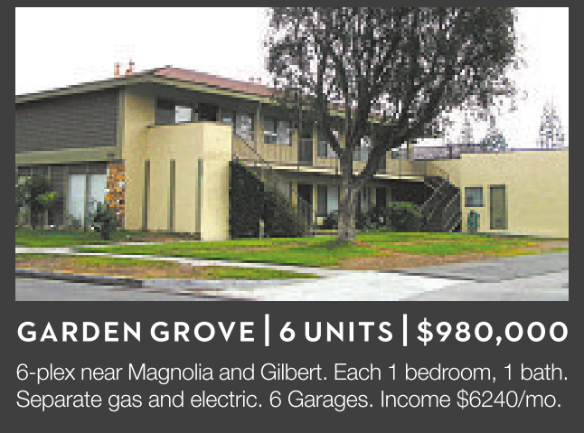 6-plex near Magnolia and Gilbert. Each 1 bedroom, 1 bath. Separate gas and electric. 6 Garages. Income $6240/mo.