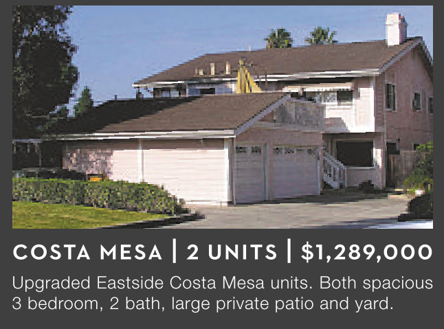 Upgraded Eastside Costa Mesa units. Both spacious 3 bedroom, 2 bath, large private patio and yard.