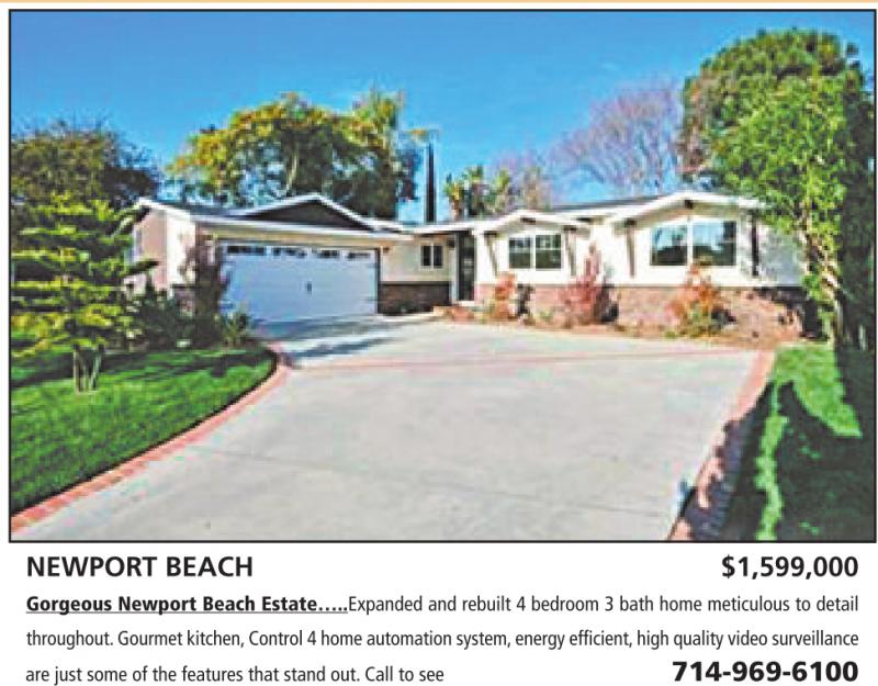 NEWPORT BEACH $1,599,000 Gorgeous Newport Beach Estate…..Expanded and rebuilt 4 bedroom 3 bath home meticulous to detail throughout. Gourmet kitchen, Control 4home automation system, energy efficient, high quality video surveillance are just some of the features that stand out. Call to see 714-969-6100